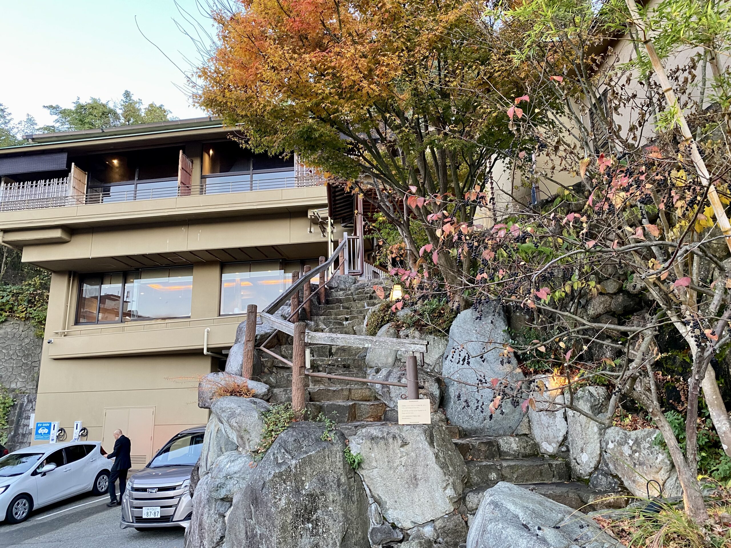 温泉街を見下ろす高台にひっそりと佇む創業70年の老舗宿、高山荘華野。20段の石段を登ったところが玄関。