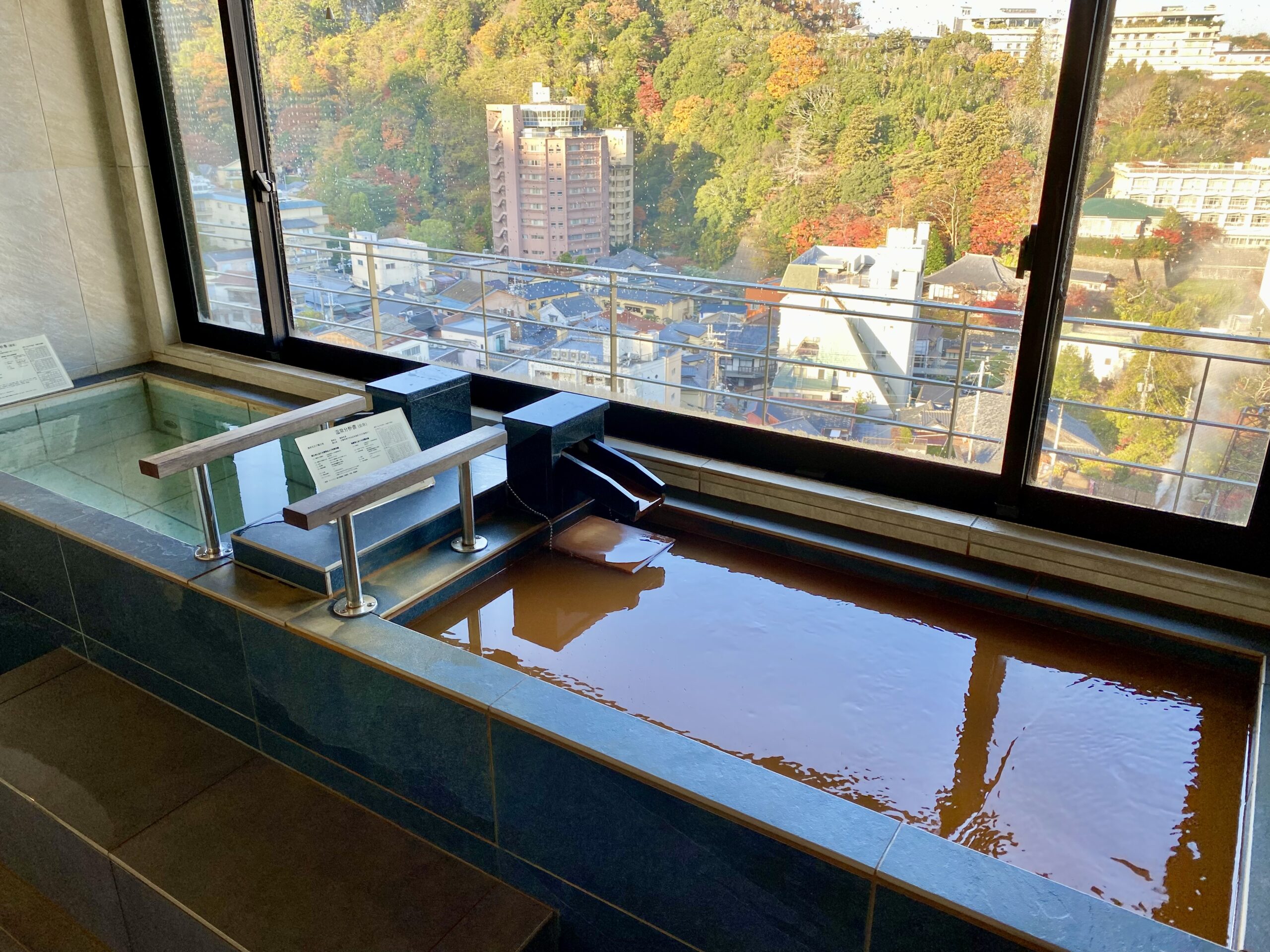 ガラス張りの浴室からは、有馬の温泉街が見下ろせる。