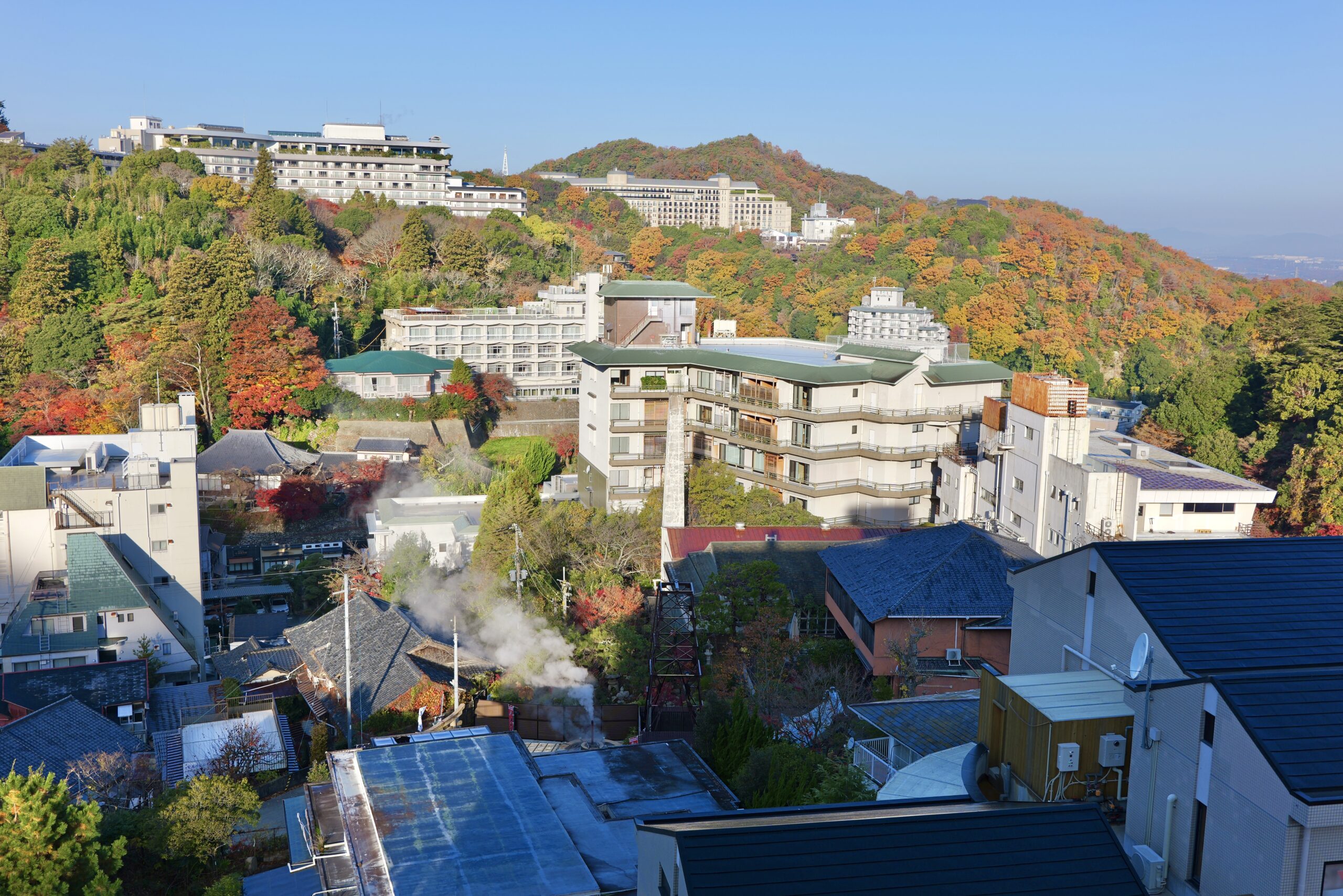 六甲山の山並みと有馬の温泉街が見渡せる。眼下にのぼる湯煙は天神泉源。