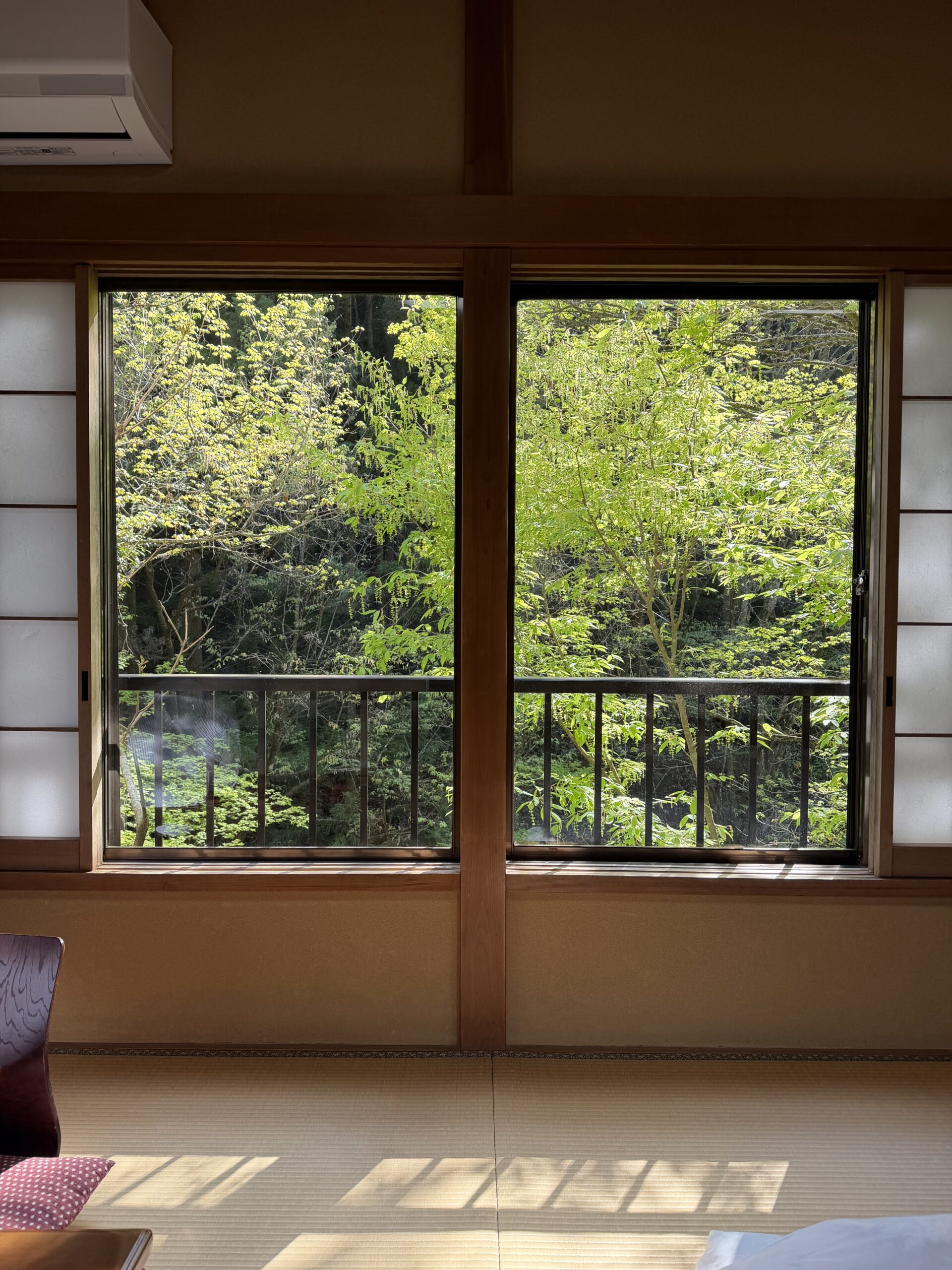 南秋川の渓流に面していて、窓の景色は清々しい新緑。