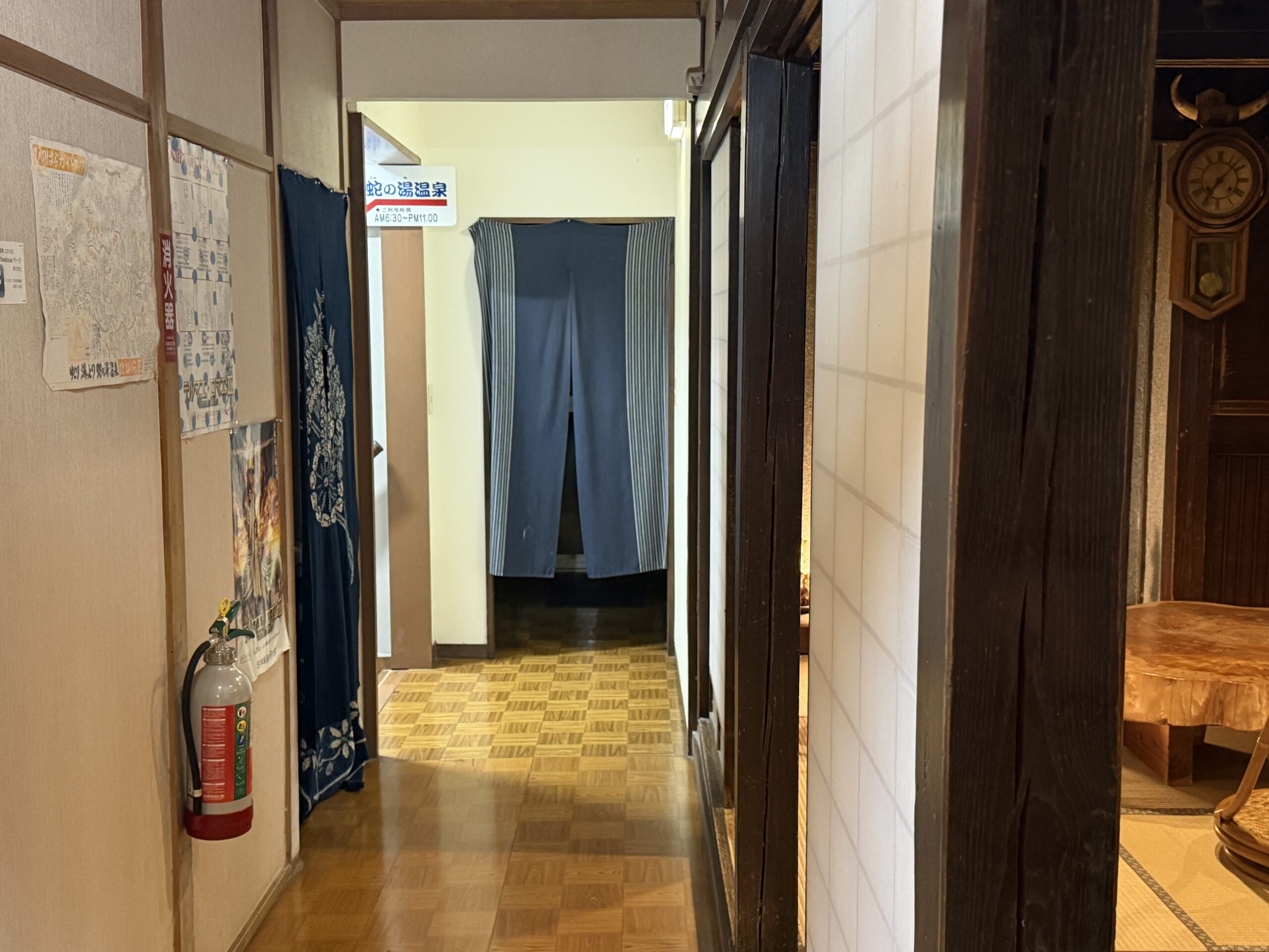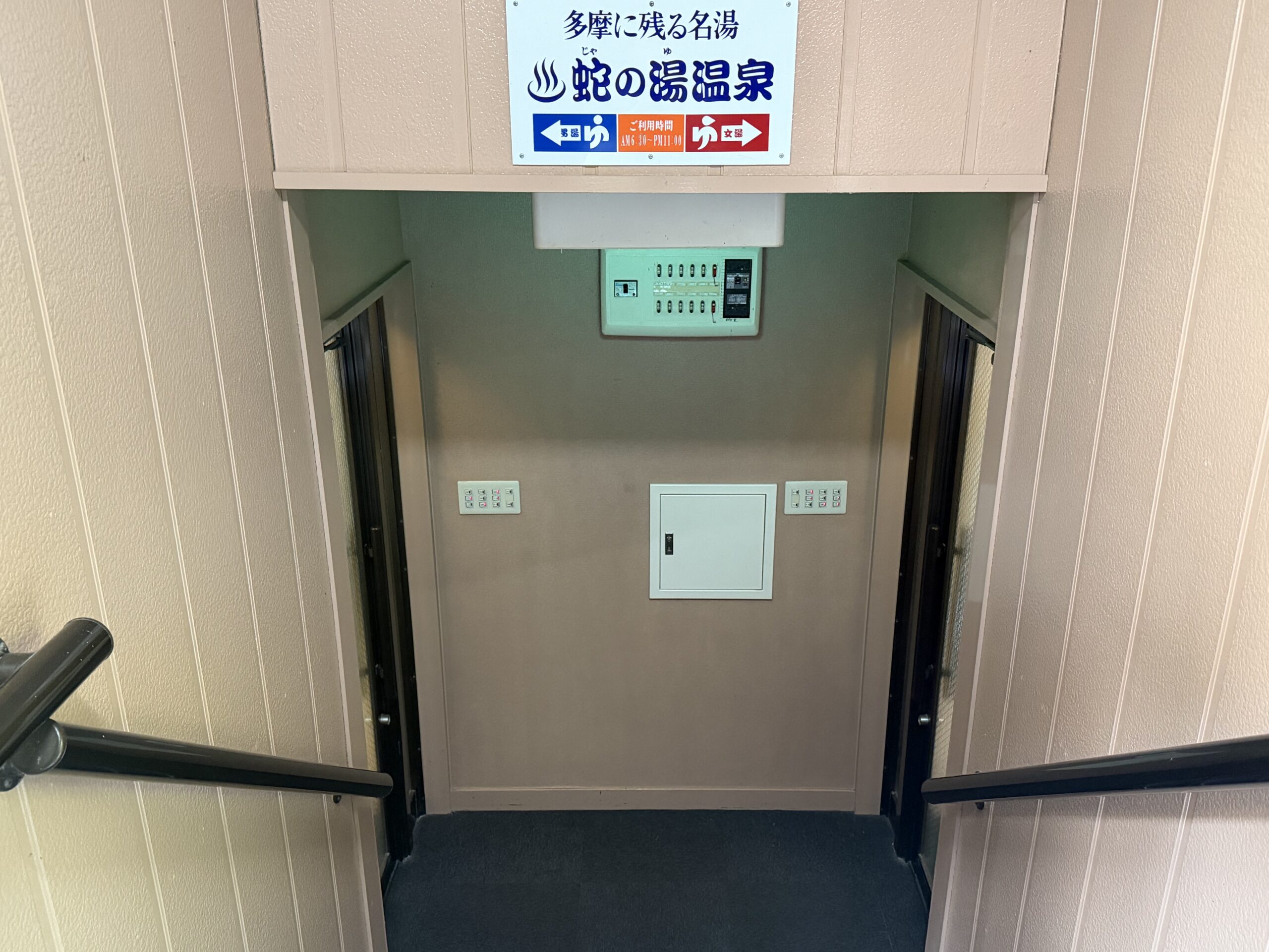 突き当たりで、女湯が右、男湯が左。男女入れ替えはなし。