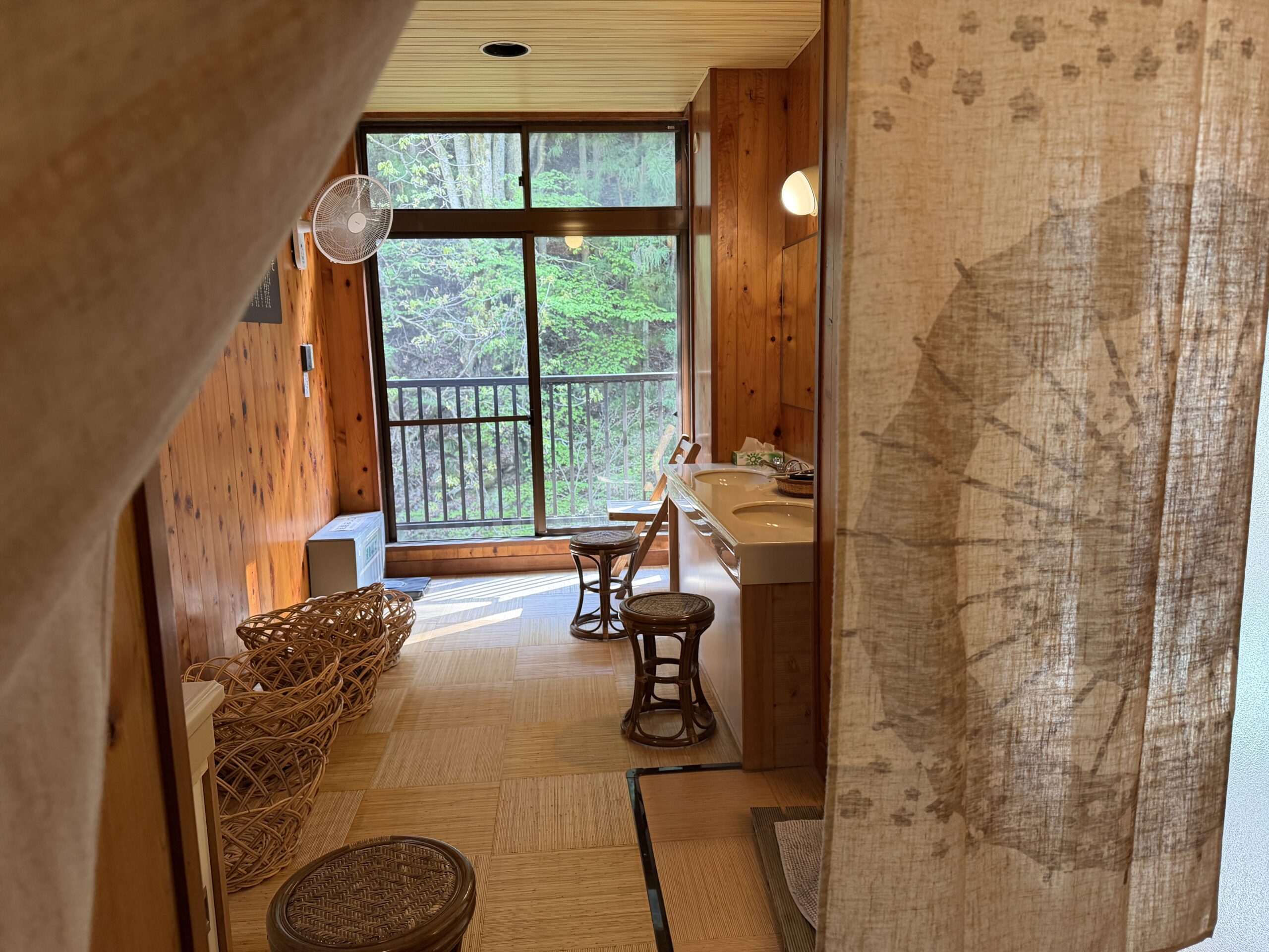 網戸からの爽やかな風に、川の流れる音と鳥の声が心地いい脱衣所。