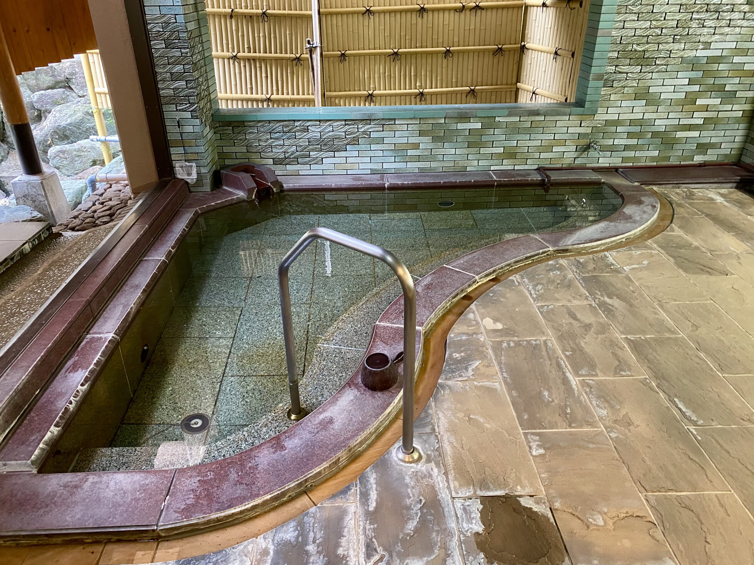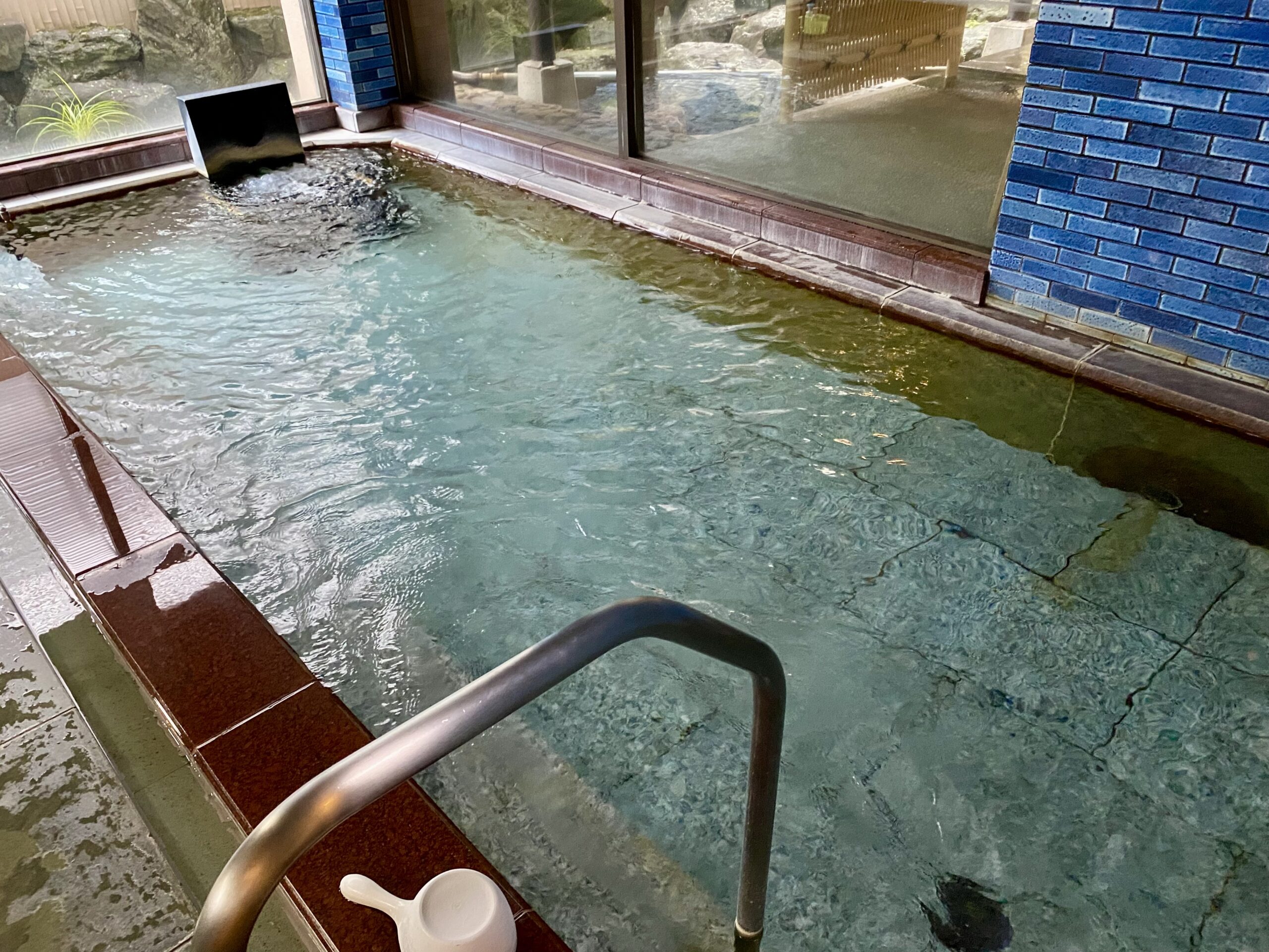 充分なサイズの湯船は両端に湯口があり、奥はジャグジー。循環の湯船みたいだけど、入れば縁から溢れる。一部かけ流しと併用。湯温は42度ちょいと熱め。