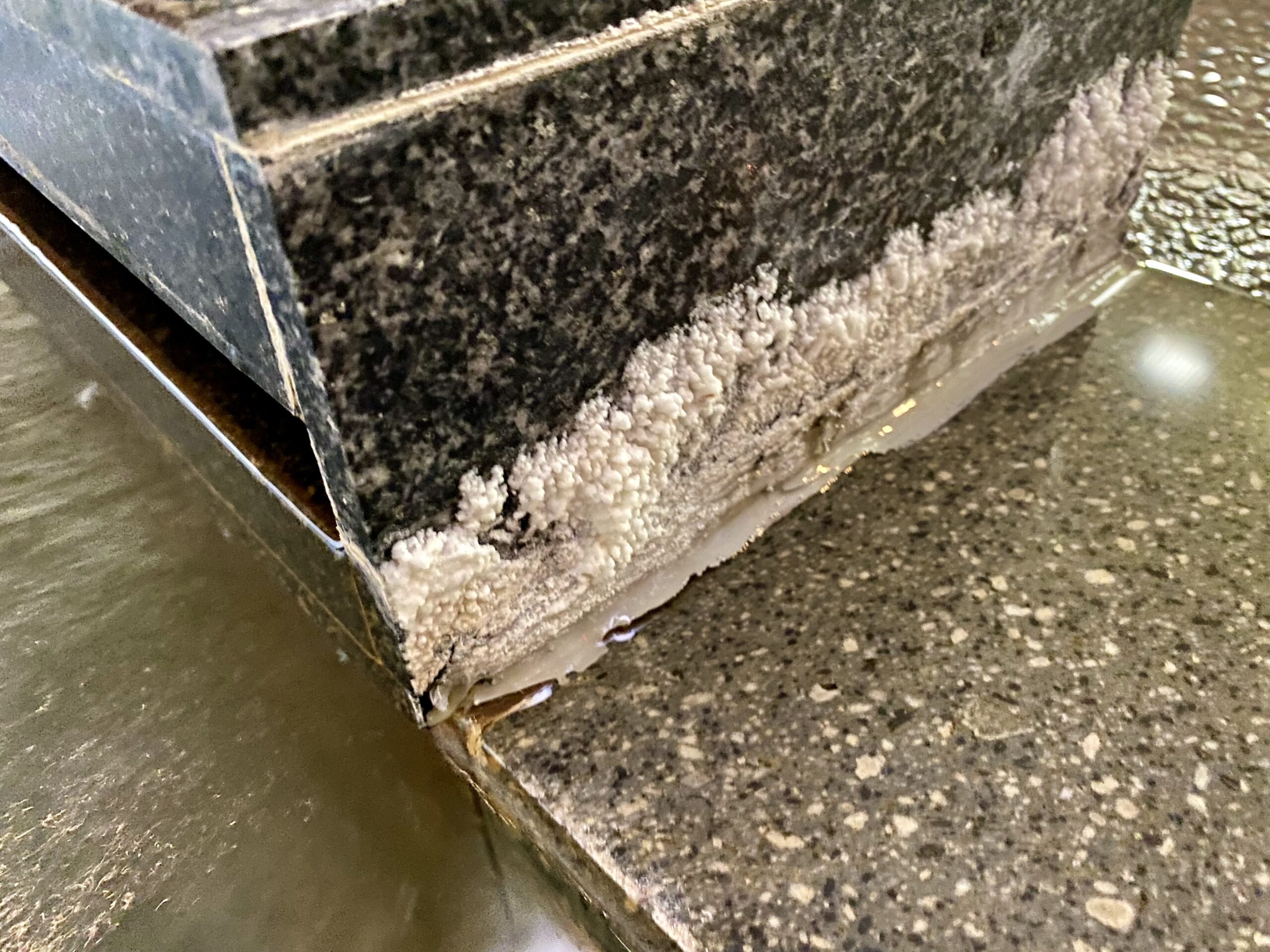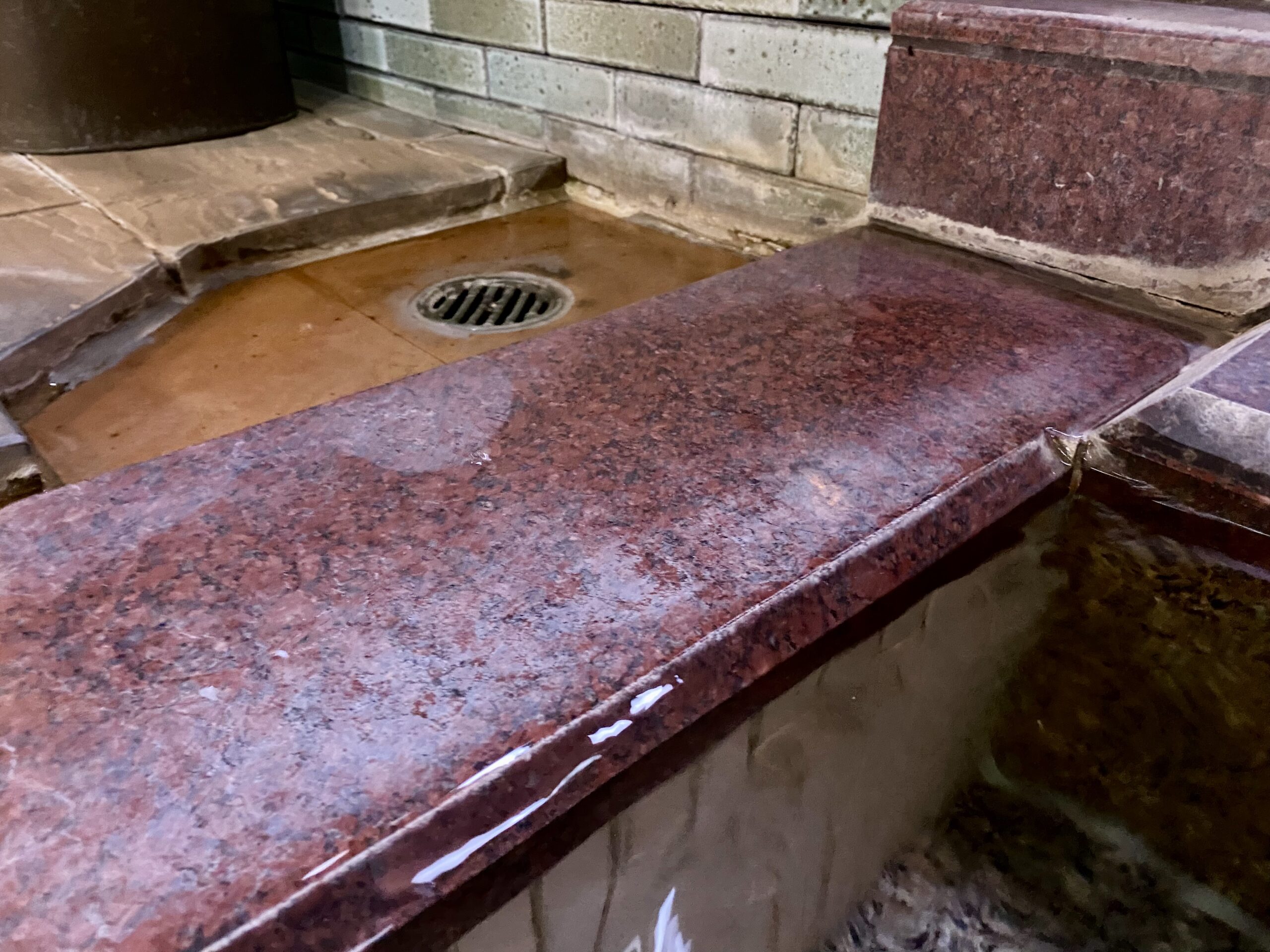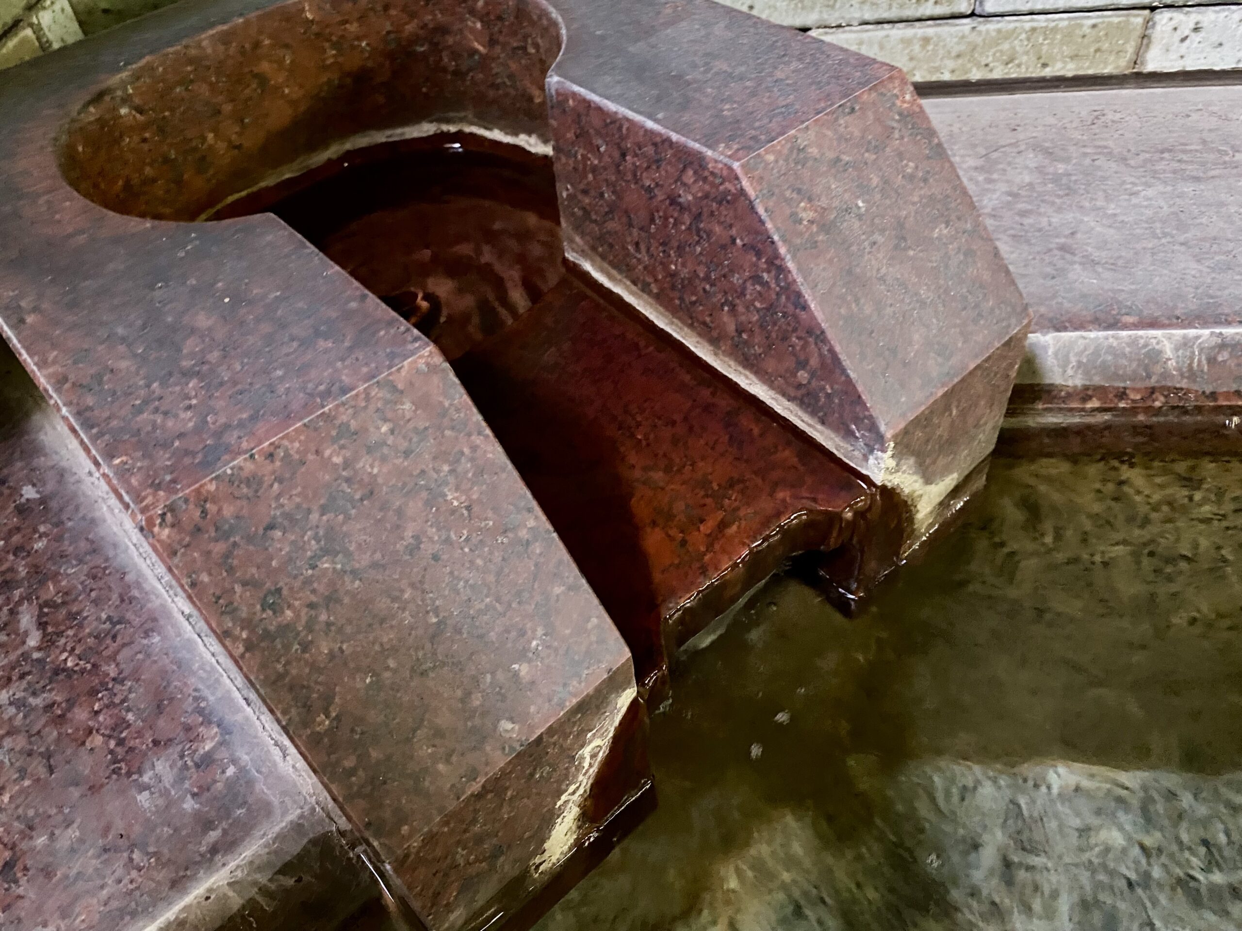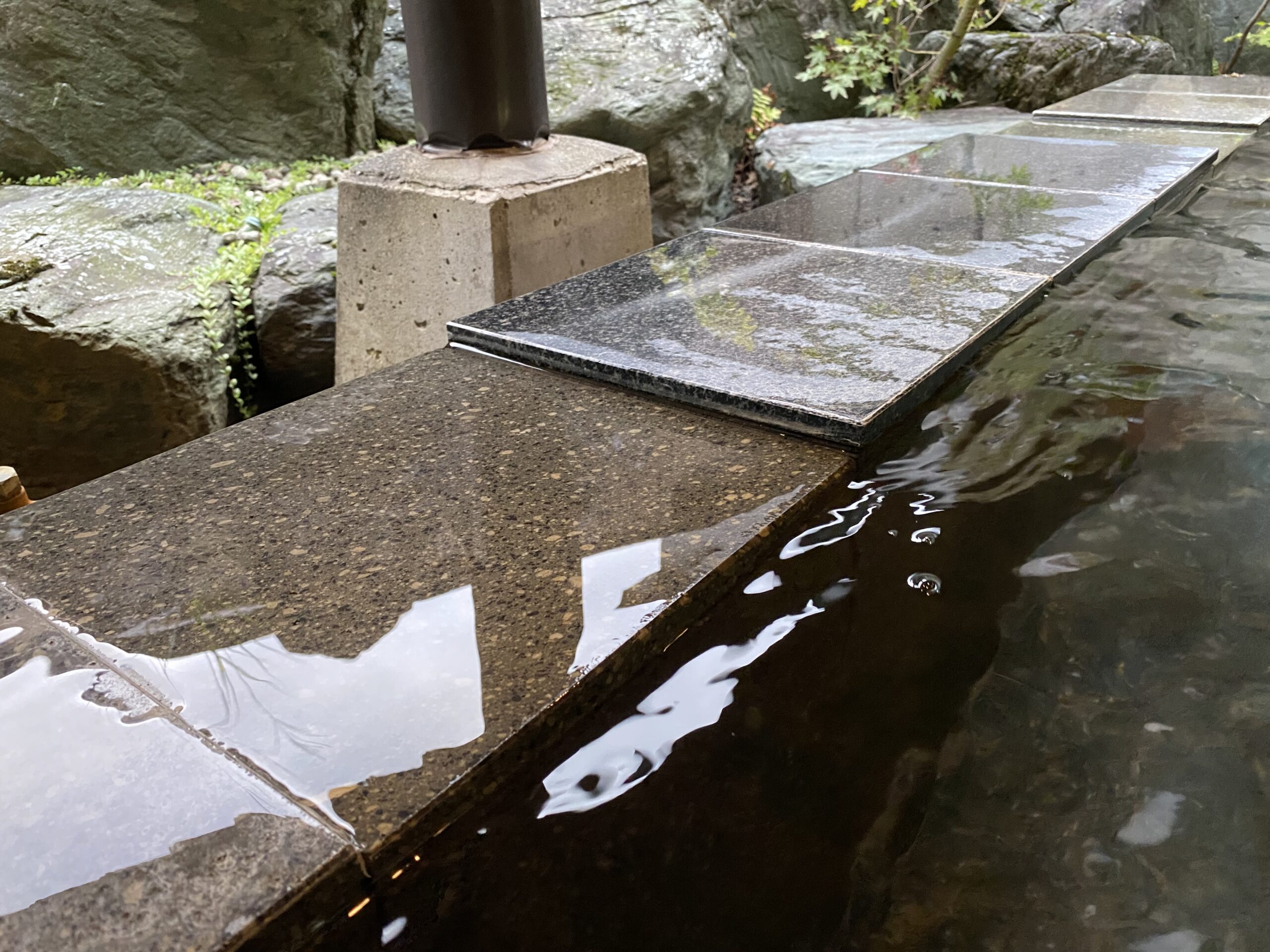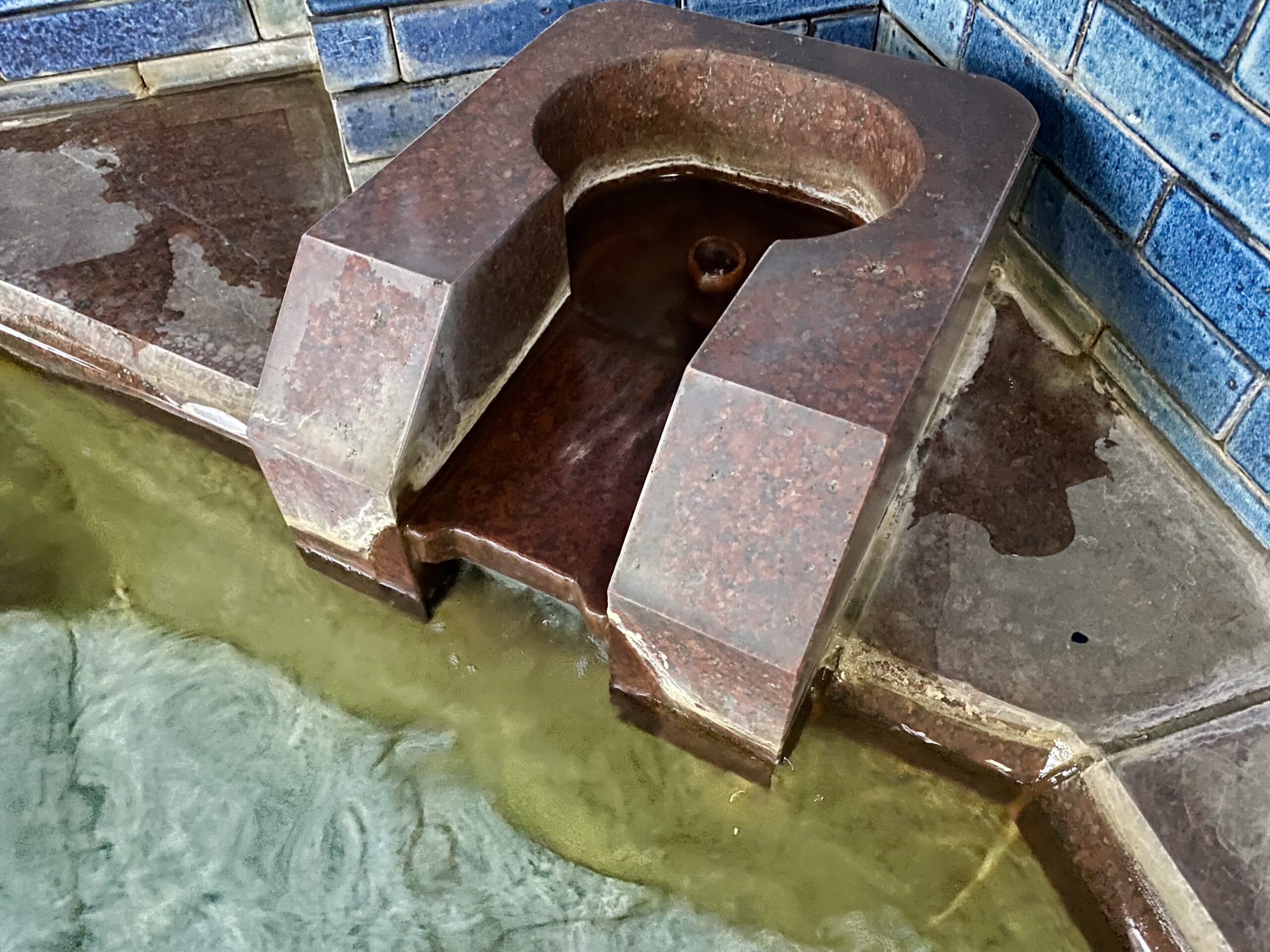 四角い石の湯口には白いぶつぶつの析出物が、単純温泉とは思えないくらいしっかり付いてる。