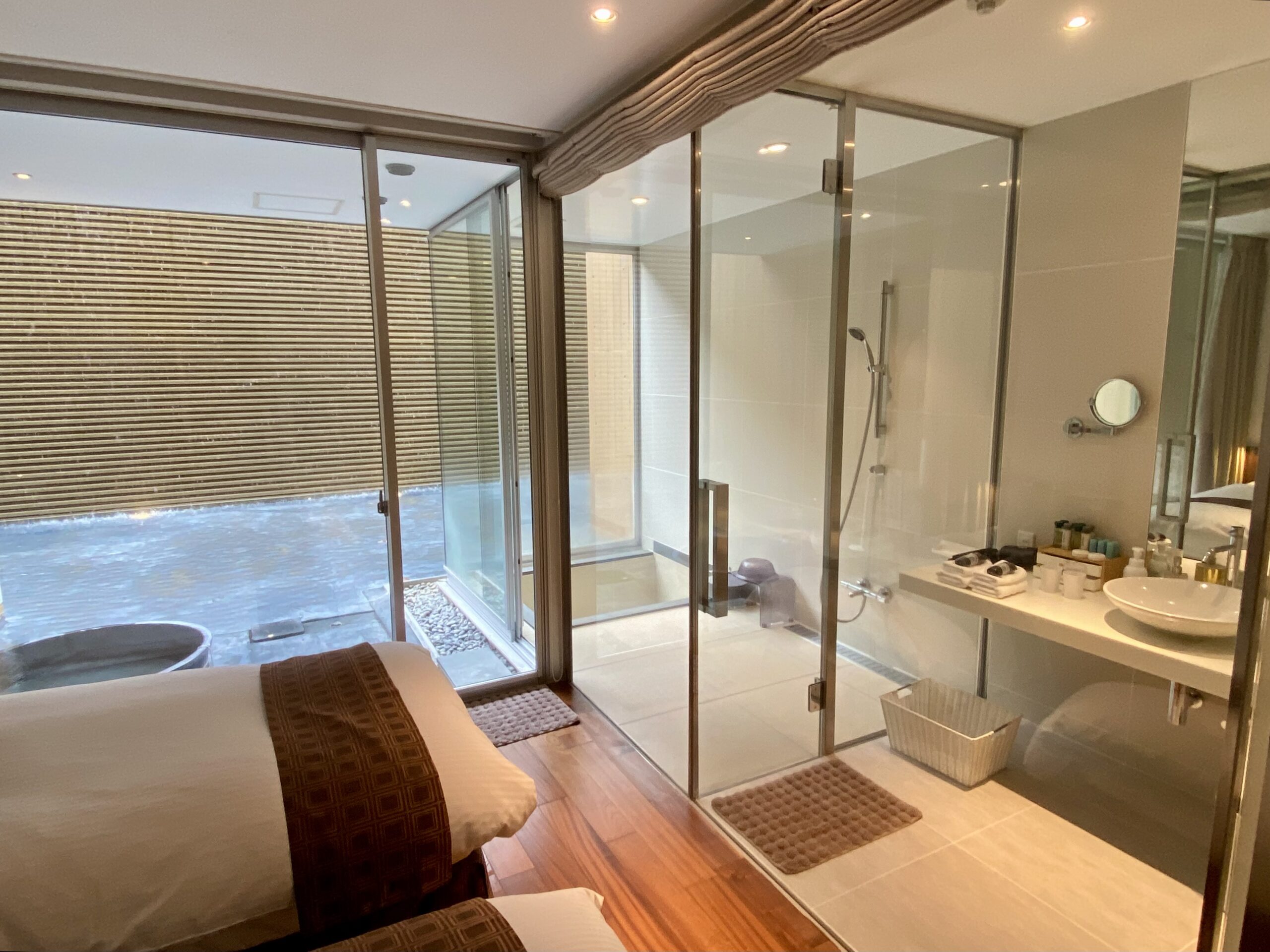 24時間いつでも入れるのが、部屋風呂のいいところだと思うのだけど、寝室から出入りしなきゃいけないから、ひとりで泊まってない限り、いつでも気兼ねなく入るというわけにいかない。なんでこんな間取りなのかな。