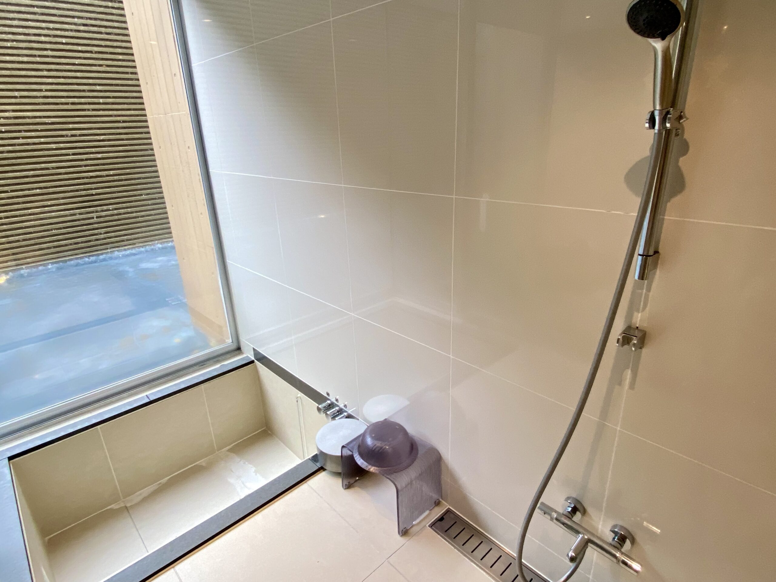 浴室には内風呂とシャワー。こちらはお湯が張られてない。チェックイン時に“かけ流しの露天風呂”の説明があったけど、内風呂の説明はなかった。空の湯船を見て、温泉じゃないんだとめちゃくちゃがっかり。