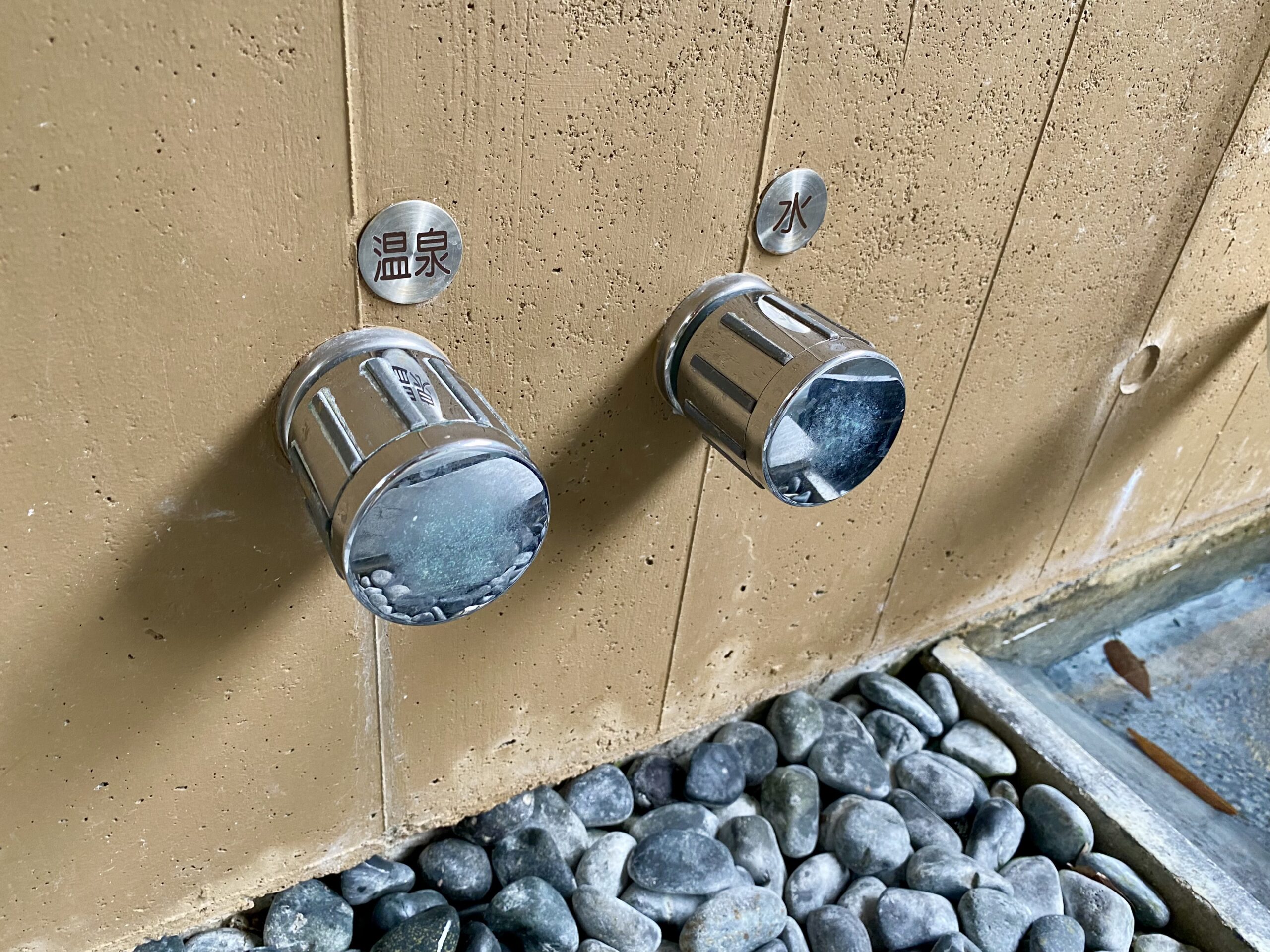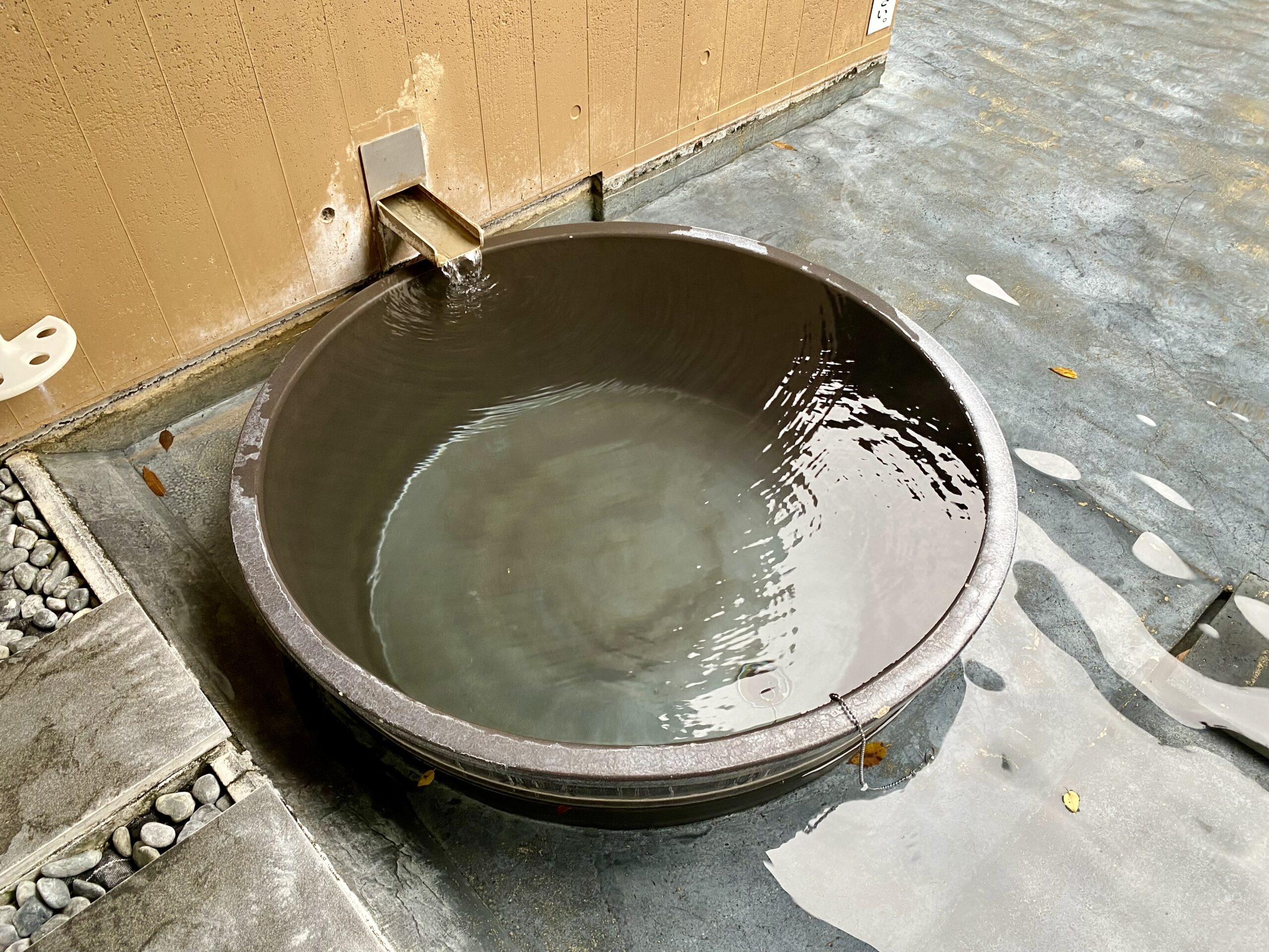 温泉のカランがあることに気付いて、お湯を張ってくれてた。湯口は49.5度弱で、温泉だけで溜めると46度と熱いけど、湯を止めてしばらく経つとかなりぬるくなってた。その後は熱い源泉を足して適温にしながら入るので、水で埋める必要もなし。