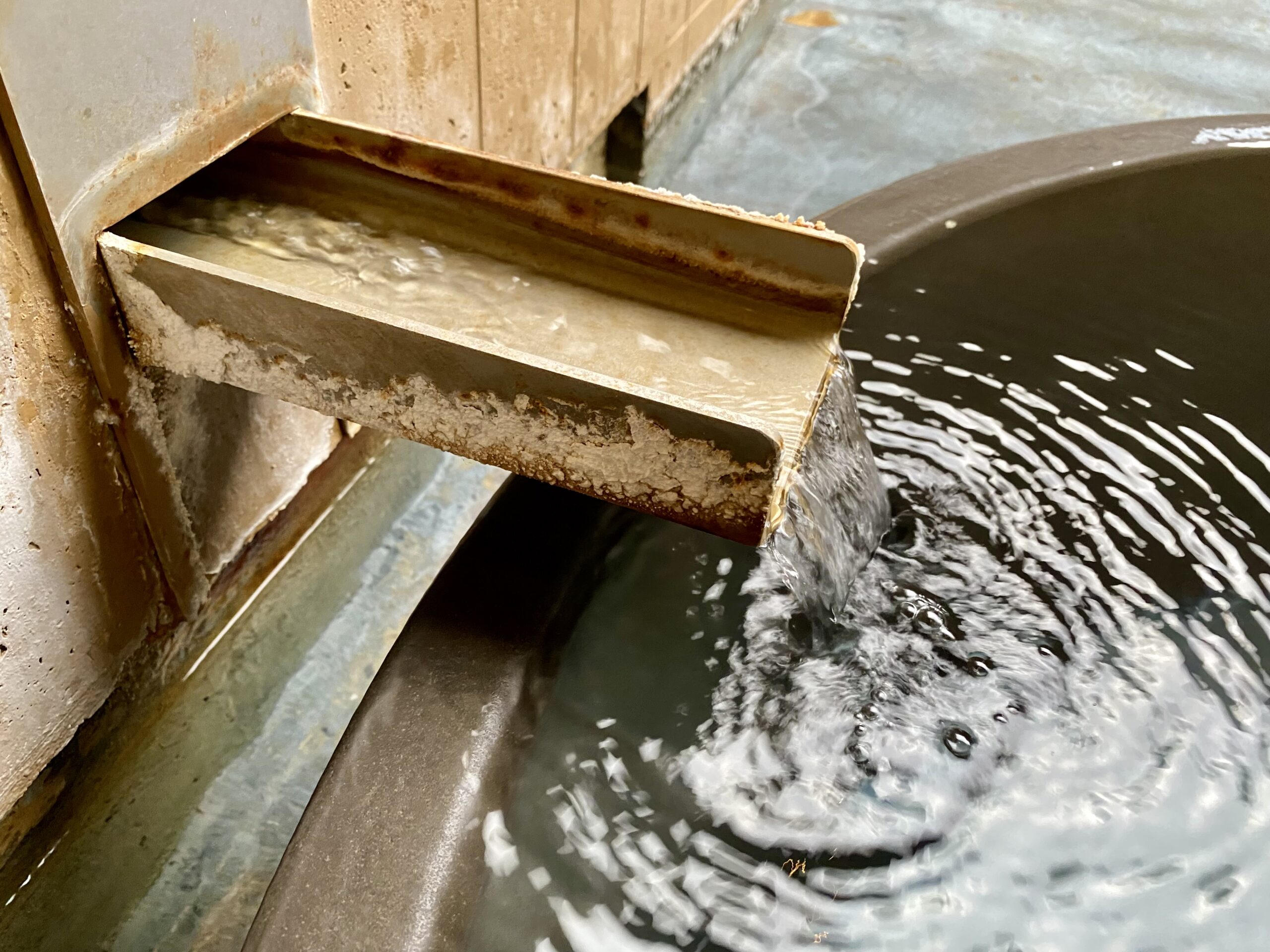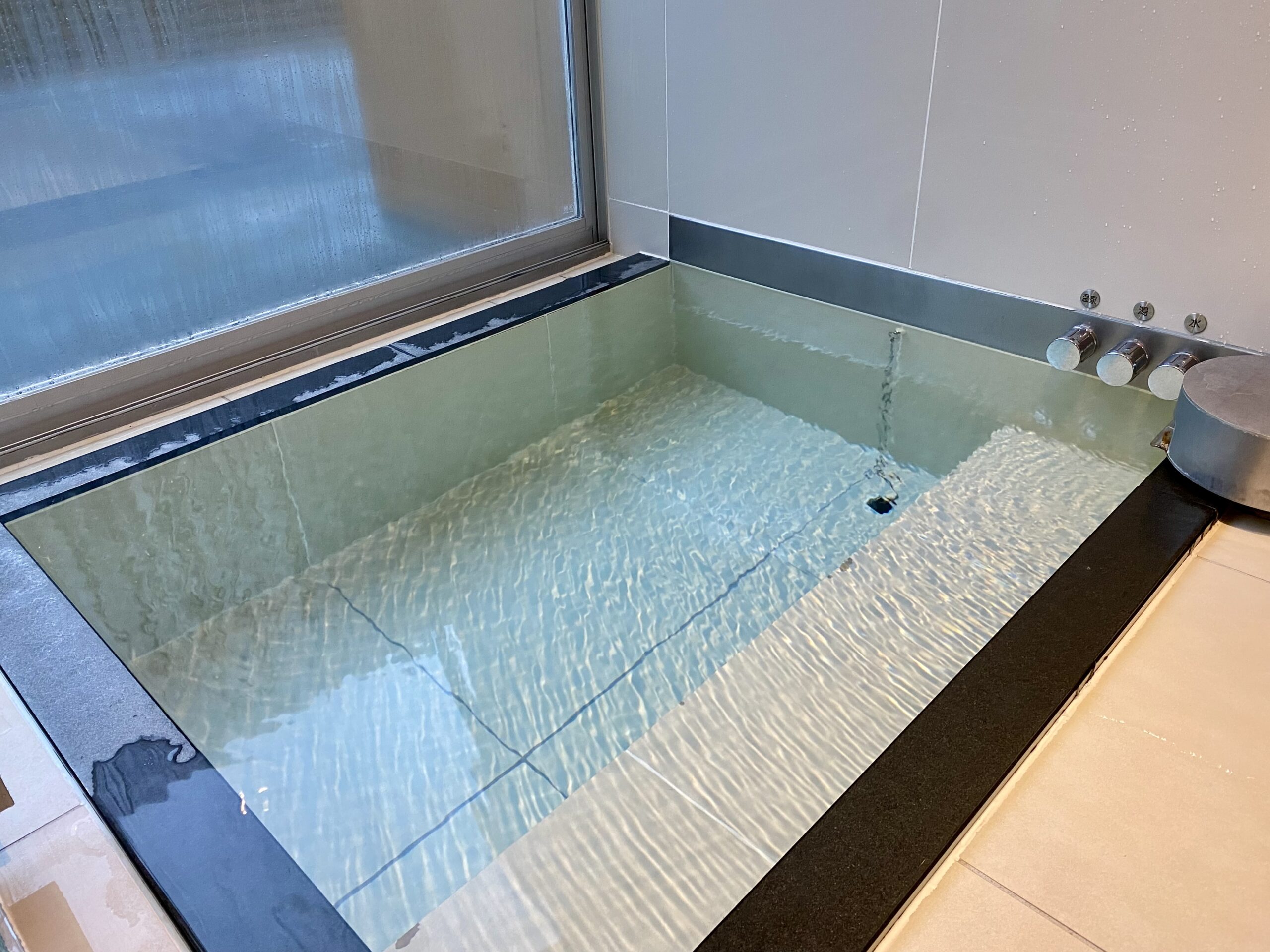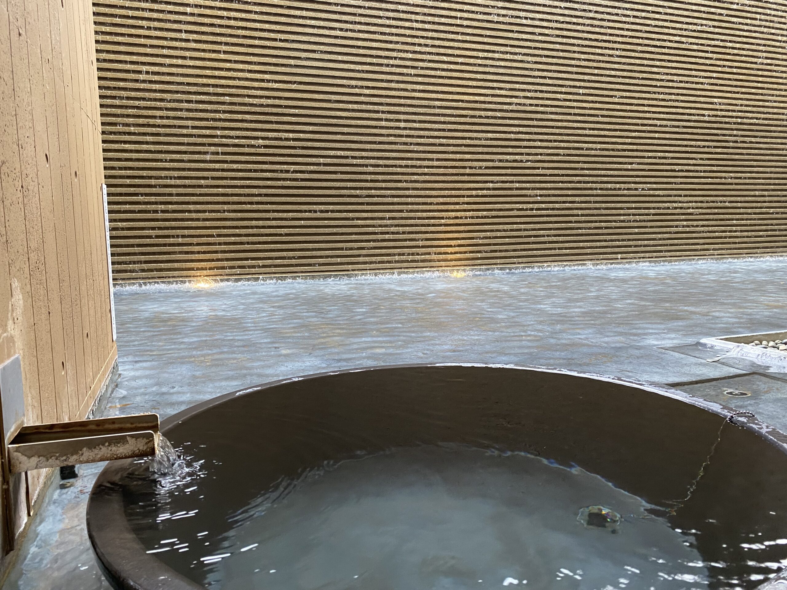 お湯たっぷりの大きな湯船、気持ちいい。pH 7.9の弱アルカリ性で、きゅっきゅと吸い付くような肌触り。塩素臭は分からなかった。