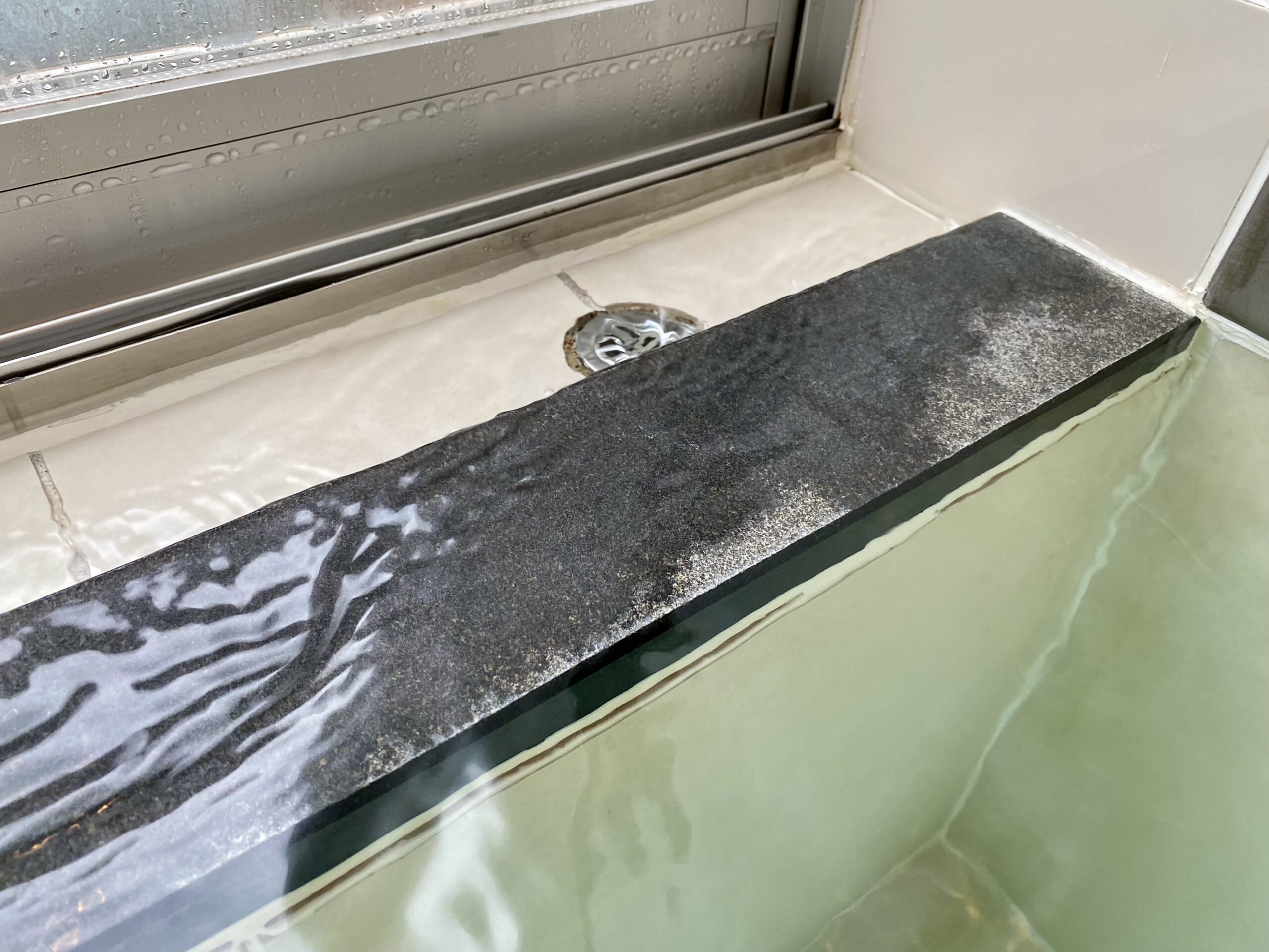 奥に排湯口があるけど、縁から洗い場側へも溢れる。