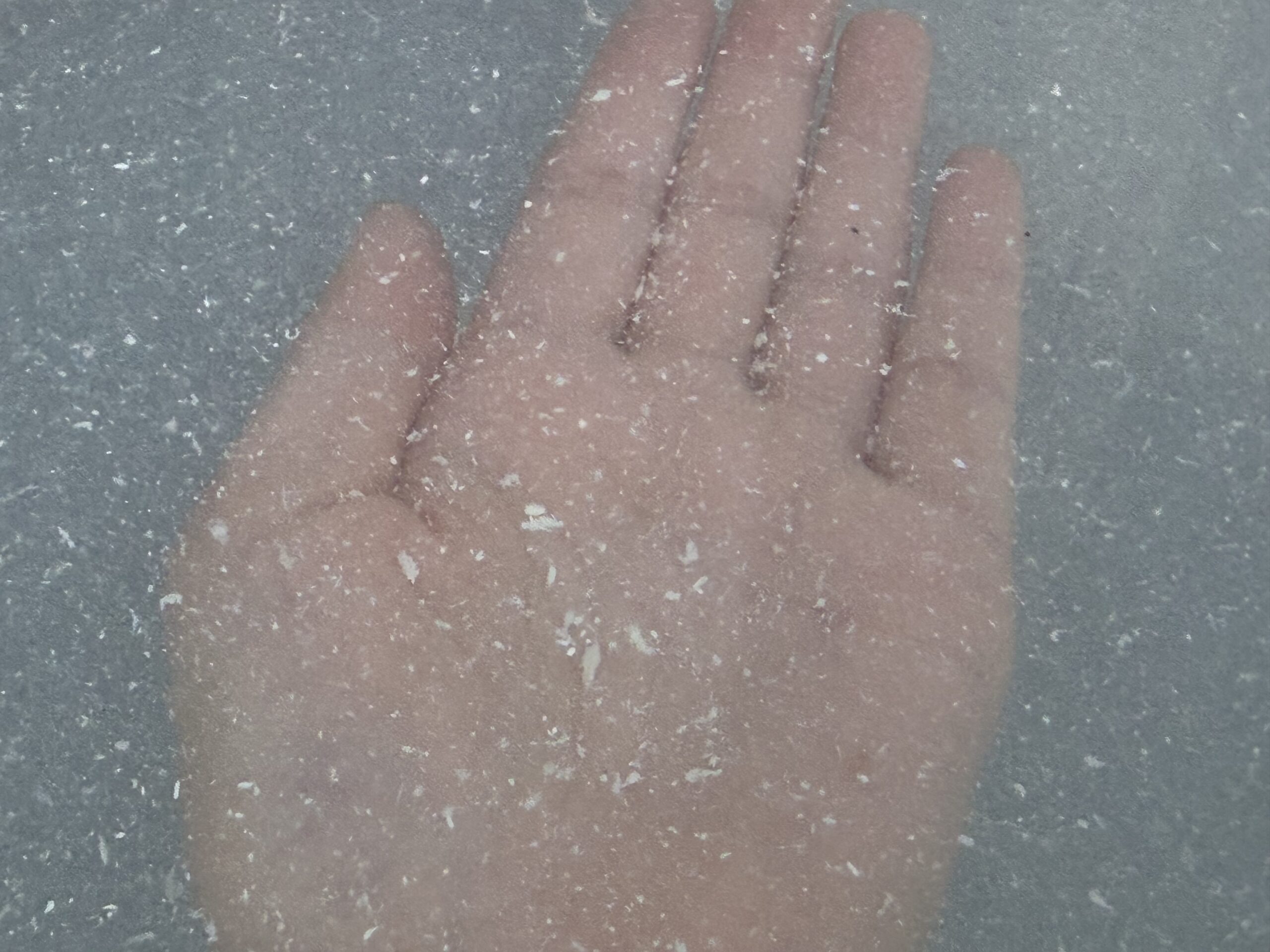 じっとしてると湯の花が身体に積もってく。湯上がりのおへそに白い湯の花がたまってるの久しぶりかも。手のひらや身体も粉だらけ。