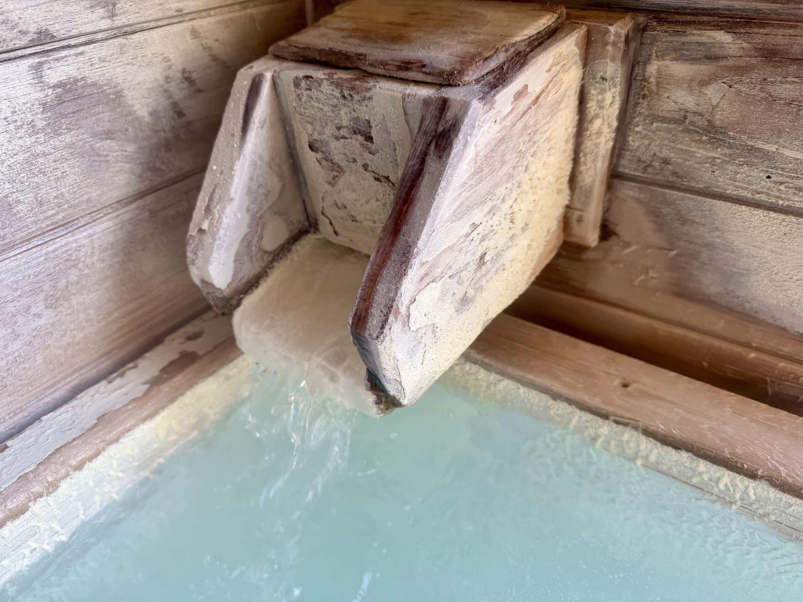 大浴場や貸切風呂に比べると、1番小さいからなのか、濃く感じる。まったりした濃い硫黄の箱って感じ。湯からあがると湯の花が身体のあちこちに引っ付いてる。
